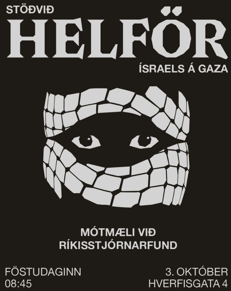 Mótmæli við ríkisstjórnarfund föstudaginn 3. október klukkan 8:45, Hverfisgötu 4. Boðaðar aðgerðir ríkistjórnarinnar eru gagnslausar gagnvart þjóðarmorði Ísraels í Palestínu. Frestur Alsherjarþings SÞ til Ísraels til þess að binda enda hernámið í Palestínu er liðinn, og Ísland er skyldugt til þess að bregðast við. Friðartillögur Trumps eru lítið annað en tálsýn og Ísraelsk áætlun um áframhaldandi hernám, kúgun og drottnun yfir palestínsku þjóðinni. Fjölmennum og lifi frjáls Palestína!